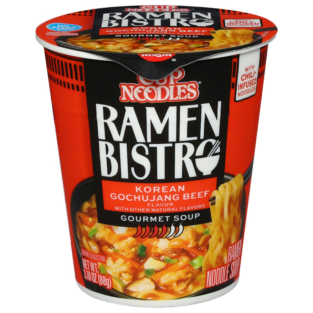 Pull up a chair at the Cup Noodles® Ramen Bistro where chili-infused noodles and hearty vegetables are bursting with bold flavors inspired by your favorite restaurant ramen. Cup Noodles® Ramen Bistro Korean Gochujang Beef features savory beef broth with heat from Gochujang (Korean red chili paste) and spicy chili-infused noodles and topped with carrot shitake mushroom minced garlic and white onion -- all with no added MSG or artificial flavors.