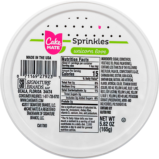 - The manufacturer of Unicorn Love Sprinkles is Cake Mate.