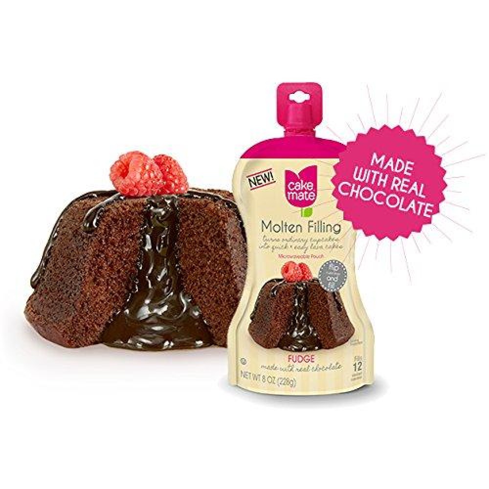 Turns ordinary cupcakes into quick & easy lava cake. Fills 12 standard cupcakes. New! Microwavable pouch. Flip cupcakes and fill. Fudge made with real chocolate. Gluten free. Create delicious fudge filled desserts with Cake Mate Molten Filling. Simply take a cupcake, flip it over and fill it with this warm, rich fudge sauce to create a delish dessert in seconds!