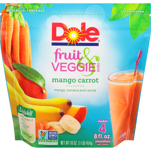Dole Fruit & Veggie Blends Mango CarrotMangos, Bananas, Carrots, and Ascorbic and Citric Acids (to promote color retention) .Keep frozen.