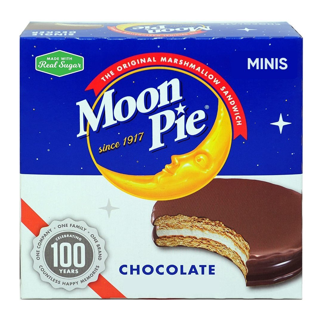 Galletas MoonPie con un gran malvavisco intercalado entre dos grandes galletas crujientes cubiertas de chocolate.