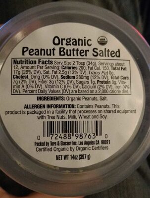 - The UPC barcode for Organic Peanut Butter Salted is 0072488987630.