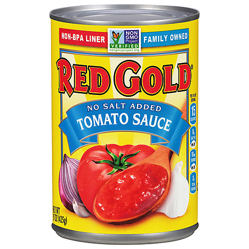 Red Gold Tomato Sauce No Salt Added is ideal for all your favorite family recipes while allowing you more flavor control. Using fresh family farm-grown tomatoes a fourth-generation family-owned company crafts this savory red sauce for use at your family s table. This canned tomato sauce is made from Non-GMO Project Verified large ripe tomatoes ensuring it s healthy and environmentally friendly. You can add this tomato sauce to everything from pasta red sauce to your favorite chili recipe; its bright red color and robust vine-ripened flavor enhance your other ingredients for great performance.