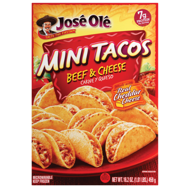 Jose Ole lets you create a fiesta of flavor that your whole family will love. Jose Ole Beef & Cheese Mini Tacos are made with seasoned ground beef, real cheddar cheese, onions, zesty green chiles, and authentic seasonings and spices--all folded in crispy, oven-baked corn tortillas. Great for snacking or entertaining, it's a flavorful fiesta in a fun-to-eat size./.