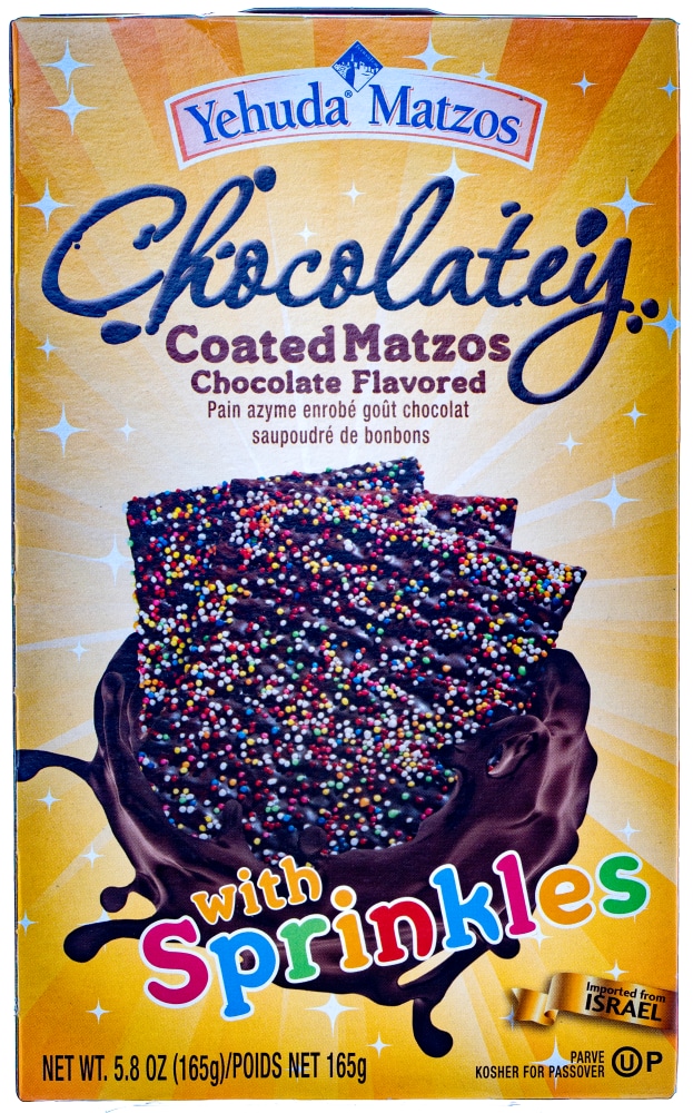 Chocolate Covered Matzo with Sprinkles (5.8oz.). Chocolatey Coated Matzos with sprinkles are a delicious and fun snack. Try crumbling over ice cream for a unique topping. Try crumbling over ice cream for a unique topping. Imported from Israel. Kosher for Passover. Certified by the OU.