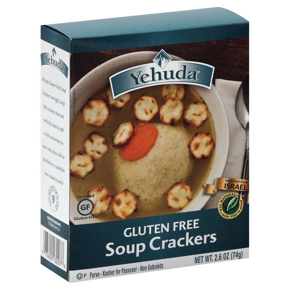 Certified gluten-free. Imported from Israel. All natural with you in mind. Non Gebrokts. Yehuda Gluten Free Soup Crackers are light, crisp little crackers that are perfectly sized to add a little excitement to your soup, stew, chili or sprinkled on a salad for some added crunch! Product of Israel.
