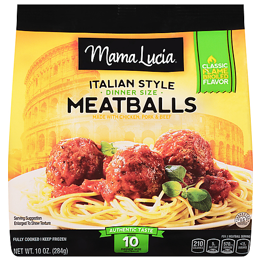 Mama Lucia® Fully Cooked Italian Style Meatballs. Microwaveable. Made with beef, pork, turkey. From Quaker Maid®. Just heat and serve for.. Dinners. Parties. Snacks. Approx. 15 dinner size meatballs. U.S. Inspected and passed by Department of Agriculture. Est. 2748. Quality control. USDA approved.