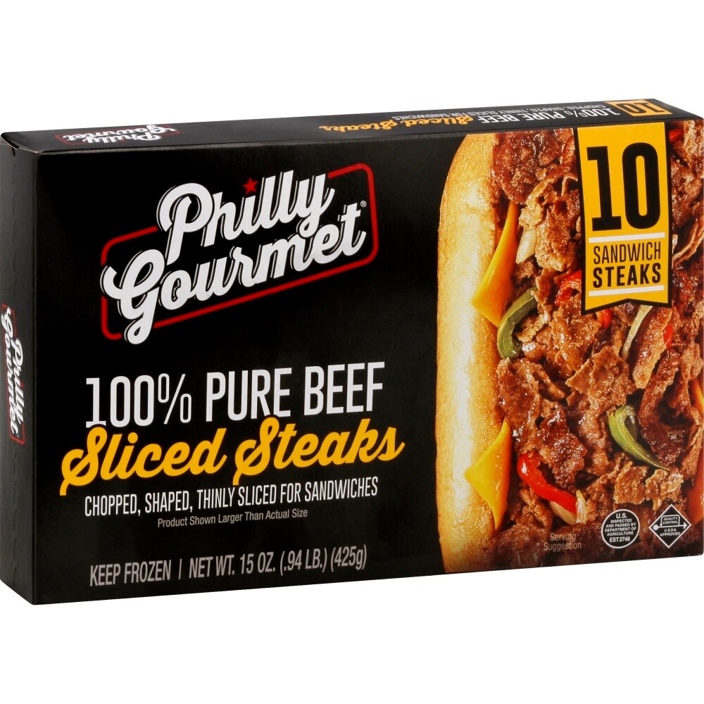 Philly Gourmet® 100% Pure Beef Shaved Steaks can be cooked in just minutes. Whether you’re making a cheesesteak or just need the perfect beefy topping, our mouthwatering steaks have you covered! Made with 100% pure beef, shaved steakEasy to cookReady to serve in minutesContains 5g of protein per serving, serving size 1 pieceRaw meat, keep frozen, ready to cookGluten free.