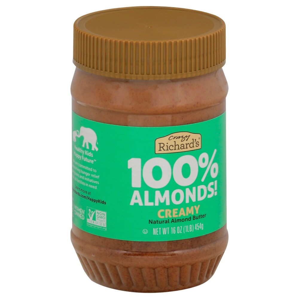Gluten free. No sugar added. See nutrition information for calorie, fat and sugar content. Not a low calorie food. Non GMO Project verified. nongmoproject.org. 100% almonds! No palm oil. Plant based. No salt. www.crazyrichards.com. Follow (at)CrazyRichardsPB for more tricks and tips! Healthy Kids Happy Future. We are committed to supporting hunger relief programs and initiatives for all families in need. Learn more at crazyrichards.com/HappyKids. Certified B Corporation. Women Owned. Made in USA.