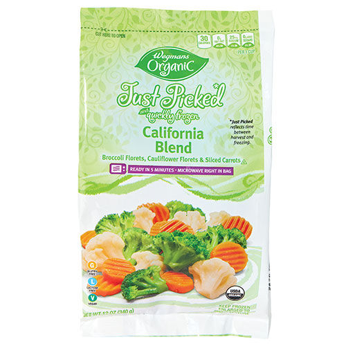 California Blend is manufactured by Wegmans Food Markets, Inc. with a suggested serving size of 1 Cup (90 G) and has 30 calories per serving.