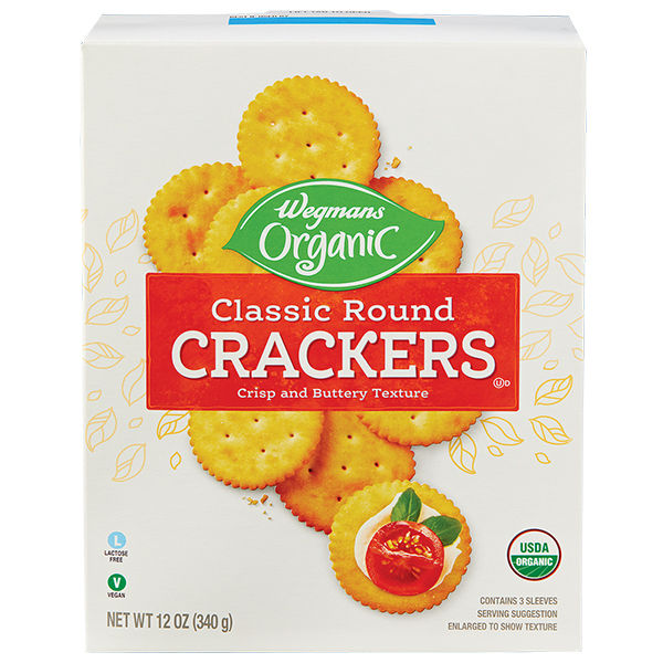 Our Wegmans Classic Round Crackers are certified USDA Organic, have a crisp, buttery taste, and melt in your mouth. They are great for dipping, topping, serving with your favorite cheese, or simply enjoying on their own! Each box contains 3 sleeves of crackers.
