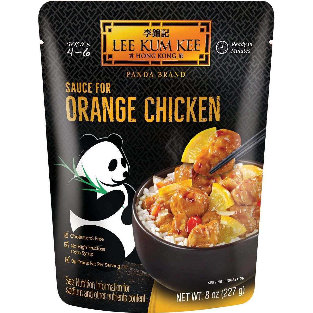 LEE KUM KEE ASIAN SAUCE FOR ORANGE CHICKEN IS PERFECT FOR DINNER WHEN YOU NEED SOMETHING THAT'S READY IN MINUTES. IT'S FREE OF ARTIFICIAL FLAVORS, CHOLESTEROL AND HIGH FRUCTOSE CORN SYRUP. THERE 0 G. TRANS FAT PER SERVING AND THE 8 OZ. POUCH SERVES 4 TO 6. ADD IN YOUR OWN.
