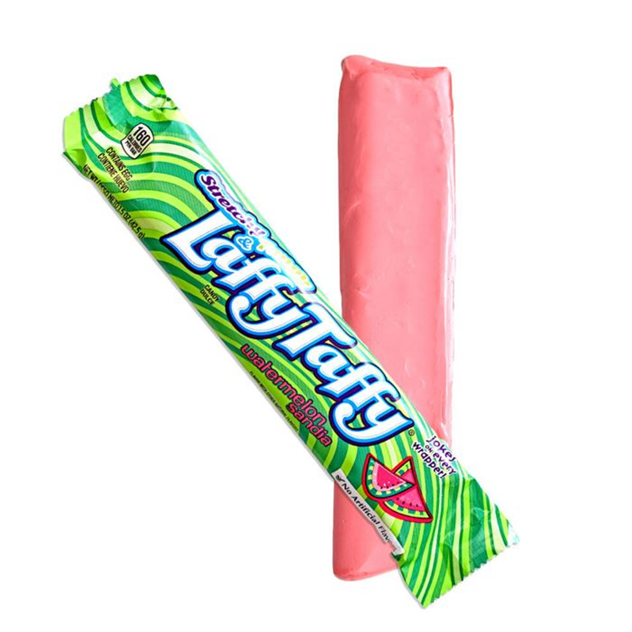 Tangy stretchy watermelon taffy. Long time favorite candy. Jokes on every wrapper. Consumers of all ages love Watermelon Laffy Taffy®, the stretchy, chewy candy with an irresistible tangy flavor. Laffy Taffy has been around for decades, during which time it has built a following of older fans who have a nostalgic fondness for the classic candy. And of course, the youngsters love Laffy Taffy for its texture and taste. These Watermelon flavored bars ship in green curvy striped perforated-top boxes.