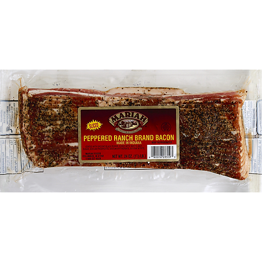 - The manufacturer of Sliced Peppered Ranch Brand Bacon is Mariah.