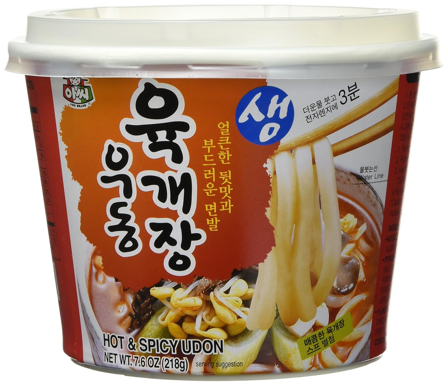 Noodle : Wheat Flour, Tapioca Starch, Salt, Alginic Acid, Water. Powder Soup : Salt, Soy Sauce Powder(Soybean, Salt, Wheat), Monosodium Glutamate, Red Pepper Powder, Spice(Red Pepper Powder, Black Pepper Powder, Garlic Powder), Onion Powder, Garlic Powder. Flake Soup : Dried Onion, Dried Green Onion, Dried Mushroom, Dried Carrot, Dried Red Pepper Powder.