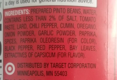 Prepared Pinto Beans, Water, Contains Less Than 2% of: Salt, Tomato Paste, Lard, Chili Pepper, Onion Powder, Garlic Powder, Spice, Natural Flavor, Paprika.