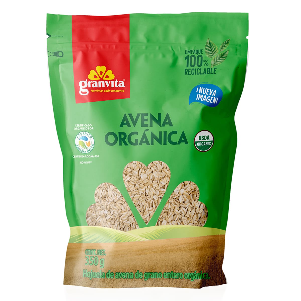 Tipo de producto Avena Marca Granvita Denominación/Variedad Orgánica Contenido neto 350 g Presentación Bolsa Advertencias de almacenamiento Consérvese en un lugar fresco y seco Porción sugerida 18.18 g Energía por porción 61 Kcal Proteínas totales por porción 2.3 g Grasas totales por porción 1 g Carbohidratos totales por porción 10.7 g Azúcares totales por porción 0 g Sodio por porción 0 mg.