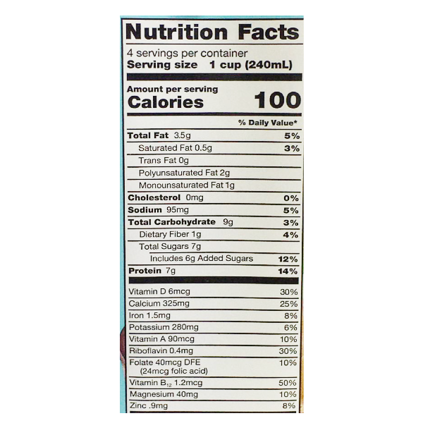 946 ml. Bebida no láctea de soya sabor vainilla. Hecha a partir de soya cultivada y procesada en los Estados Unidos. Fortificada con vitaminas. 250 mg de omega-3 por porción.