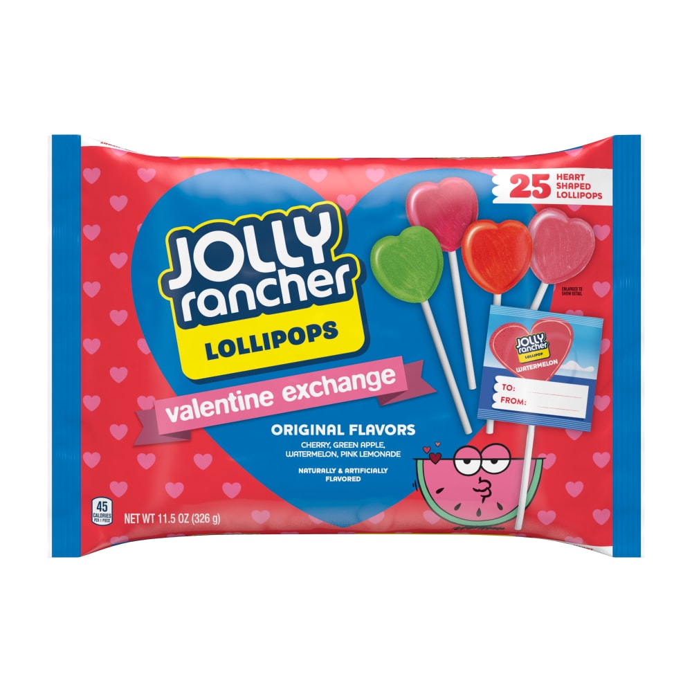 This bag of JOLLY RANCHER Lollipop Valentine Exchange Assorted Fruit Flavor Heart-Shaped Hard Candy includes hard candy lollipops in a variety of delicious fruit flavors that will send your taste buds into overdrive. Heart lollipops are the perfect size to enjoy anywhere, anytime. Fill candy dishes around the house so they're available when you want an exciting treat, or stock your snack drawer at work for a taste that keeps the day interesting no matter your choice of flavor. This pack of JOLLY RANCHER Lollipop Hard Candy includes four original fruit candy flavors: cherry, green apple, watermelon and pink lemonade. Get ready to embrace your new go-to when it's time to exchange Valentine's Day gifts with friends or provide assorted candy in themed bowls for guests to enjoy at Valentine's Day get-togethers. The festive, heart-shaped lollipops in this bag are individually wrapped for lasting freshness too, so get yours now and enjoy them as you please! Includes one (1) 11.5-ounce, 25-piece bag of JOLLY RANCHER Lollipop Valentine Exchange Assorted Fruit Flavor Heart-Shaped Hard CandyGreat as a sweet snack or for filling a candy dish at Valentine's Day partiesAn assorted 25-piece bag of individually wrapped lollipop hearts in original cherry, green apple, watermelon and pink lemonade flavorsExchange Valentine's Day lollipop heart candy with friends, co-workers and classmates or fill your party favors with original JOLLY RANCHER flavors.