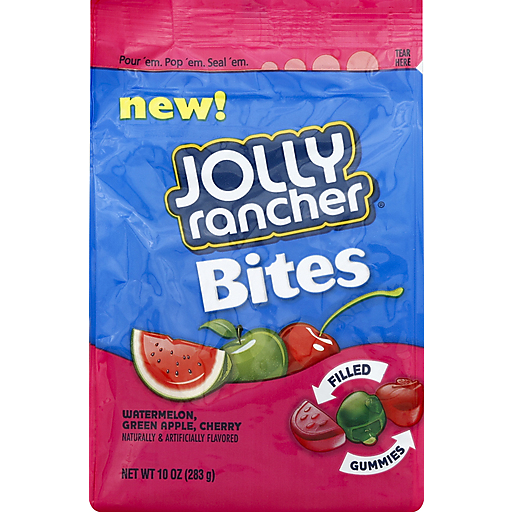 Take a bite of untamed fruit flavor with JOLLY RANCHER Bites Filled Gummies. Enjoy bite-sized gummies in watermelon, green apple and cherry flavors. Perfect for snacking at home, school, the office, and the movies. Great for eating on the go. A fat free candy.