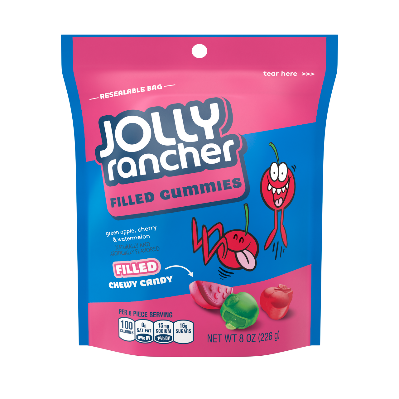 - The manufacturer of Filled Gummies, Green Apple, Watermelon, Cherry is Jolly Rancher.