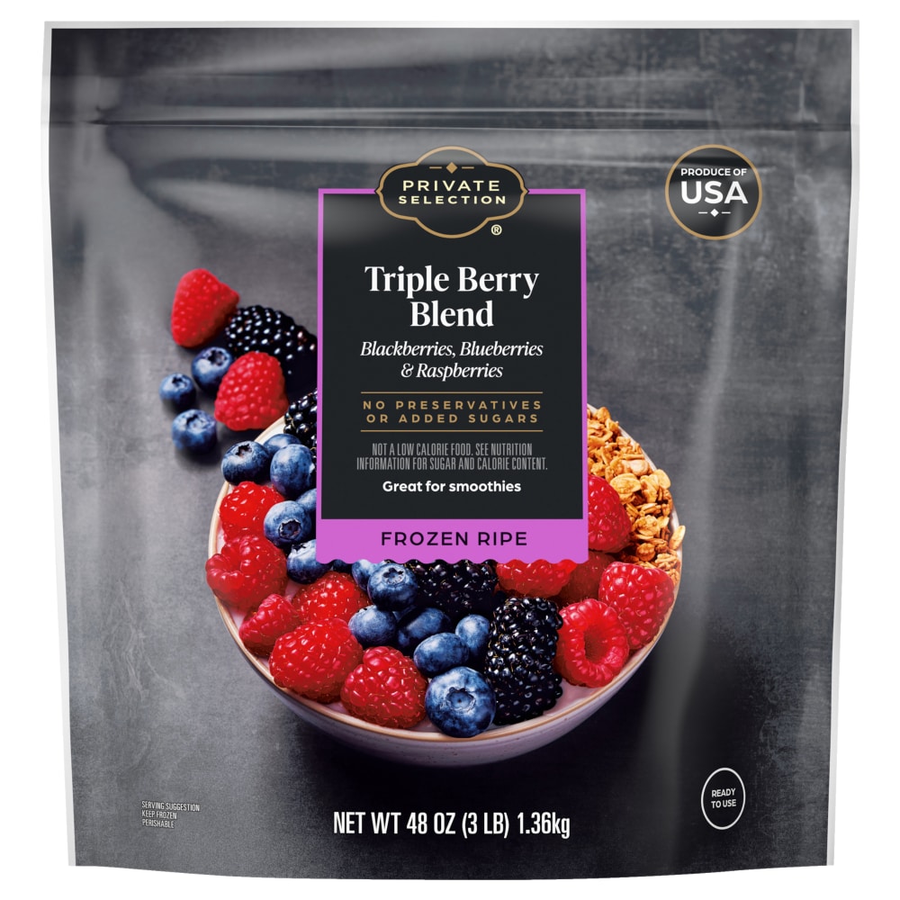 Private Selection® Triple Berry Blend Frozen Fruit is a delectable combination of blackberries, blueberries, raspberries, chosen and frozen at their peak. Frozen ripe and ready to use, this package delivers a burst of tasty sweetness and nuanced tartness, whisking your palate to a gourmet experience. Unleash culinary creativity with this versatile berry blend for luscious desserts or invigorating smoothies. Private Selection® products are anything but ordinary. Extraordinary guaranteed. 48 oz Bag of Private Selection® Triple Berry Blend Frozen FruitReady to use frozen ripe blackberries, blueberries & raspberriesStriking balance of sweet and tart berriesPicked at their peak for maximum fruit flavorCrafted with premium ingredients for an amazing eating experience.