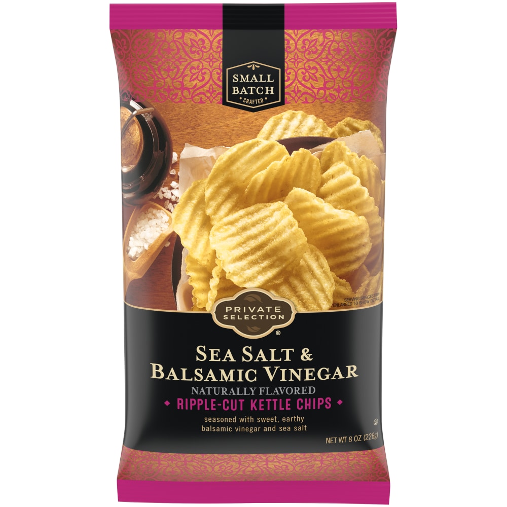 Our foods reflect our passion for exceptional culinary experiences. Explore and enjoy amazing foods and ingredients that elevate any occasion. The Private Selection™ journey rewards your sense of good taste. Inspired by food artisans and crafted with authentic ingredients and tantalizing recipes, each Private Selection™ offering is sure to feed your passion for gourmet foods. Private Selection™Sea Salt & Balsamic Vinegar Flavored Kettle Chips are made from farm-grown potatoes cut into a thick ripple, kettle cooked in small batches and seasoned with an irresistible combination of flavors. The sweet and tangy flavor of balsamic vinegar is complemented by a touch of sea salt for a new twist on a classic combination.