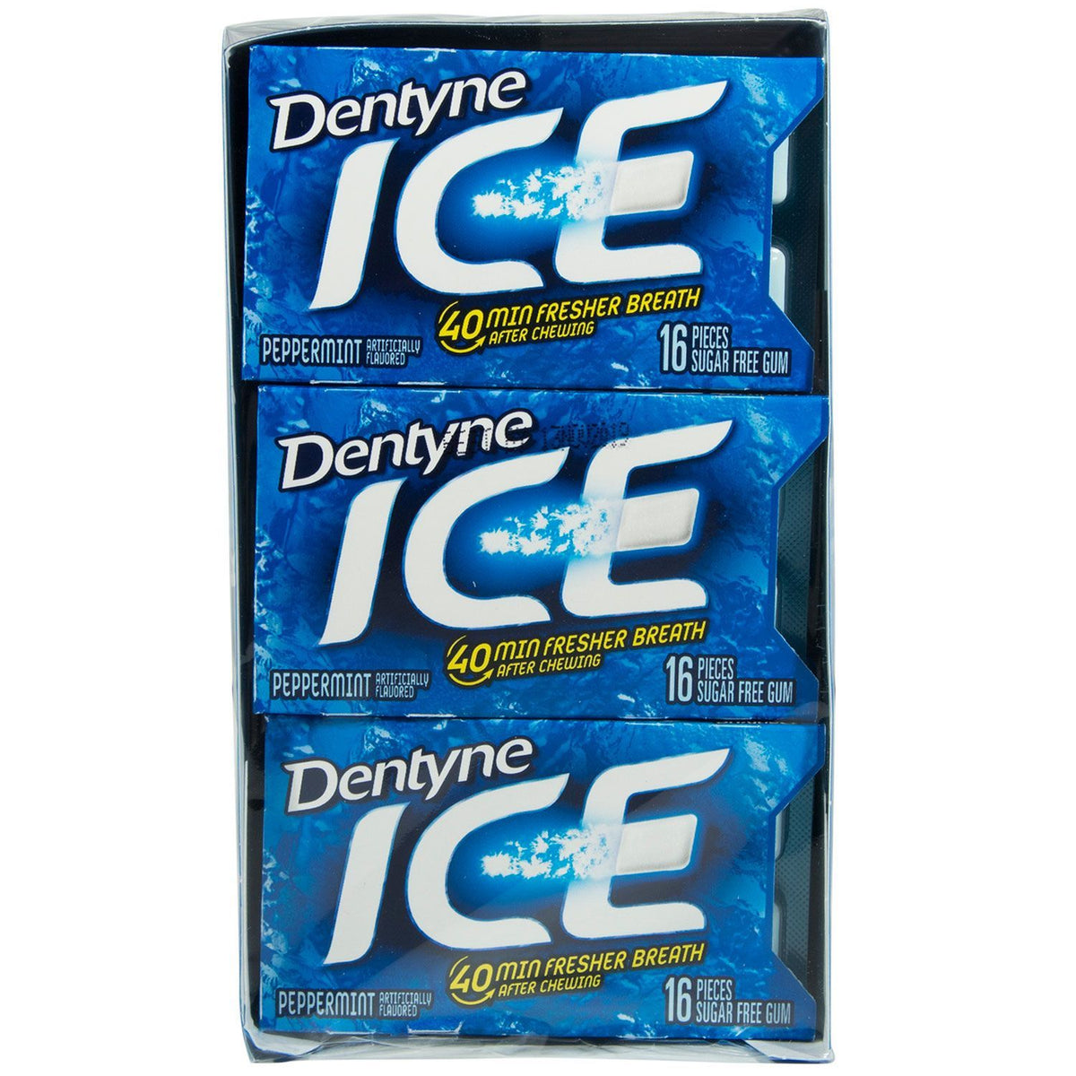 12 16-piece packs. Artificially flavored. 40 min fresher breath after chewing. Not a low calorie food. Questions? Call 1-800-524-2854. www.dentyne.com.