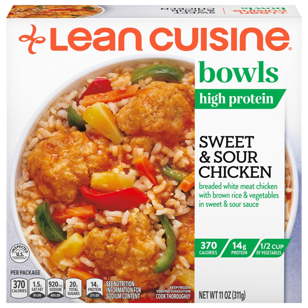 Lean Cuisine Bowls Sweet and Sour Chicken Frozen Meal offers a delicious, 370-calorie high protein meal that lets you enjoy what you love. Made with 14 grams of protein and 0.5 cup of vegetables, these easy-to-make frozen meals feature delicious breaded white meat chicken with brown rice and vegetables in sweet and sour sauce. Each bite of this frozen chicken meal is complemented by red and green bell peppers for a meal that pleases every taste bud. This Asian inspired cuisine Lean Cuisine meal offers a delicious frozen bowl made with premium ingredients for a microwave meal you can feel good about. Forget fast casual, as this convenient, frozen sweet and sour chicken meal is ready to enjoy in minutes for a quick lunch break at work or an easy dinner at home on busy weeknights. Each chicken, rice and vegetables dish comes in a convenient, single serve bowl and contains sesame. Keep Lean Cuisine frozen meals in the freezer until you're ready to enjoy.