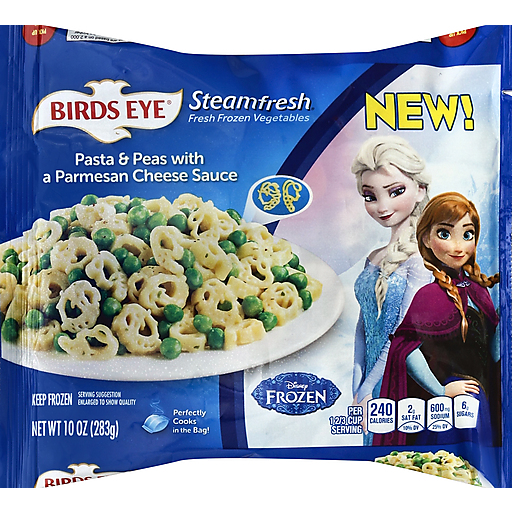 Birds Eye® Steamfresh® Pasta & Peas with a Parmesan Cheese Sauce. New! Fresh frozen vegetables. Perfectly cooks in the bag! Disney frozen. Per 1 2/3 cup serving: 240 Calories. 2g sat fat, 10% DV. 600mg sodium, 25% DV. 6g sugars.
