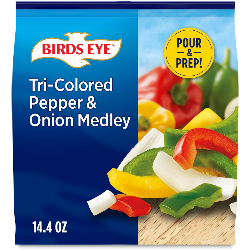 Tri-Colored Pepper & Onion Medley includes sliced green, red and yellow bell peppers and white onions. Birds Eye Pour & Prep vegetables are skillet-ready and help you mix up quick meals at home. Nothing artificial.