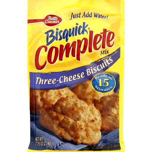 Bisquick™ Complete Biscuit Mix Three Cheese. Betty Crocker™. Just add water. Per 1/3 cup mix as packaged. 160 calories. 4g sat fat, 19% DV. 400mg sodium, 16% DV. 1g sugars. Makes 6 biscuits. Net wt 7.75 oz (219g).