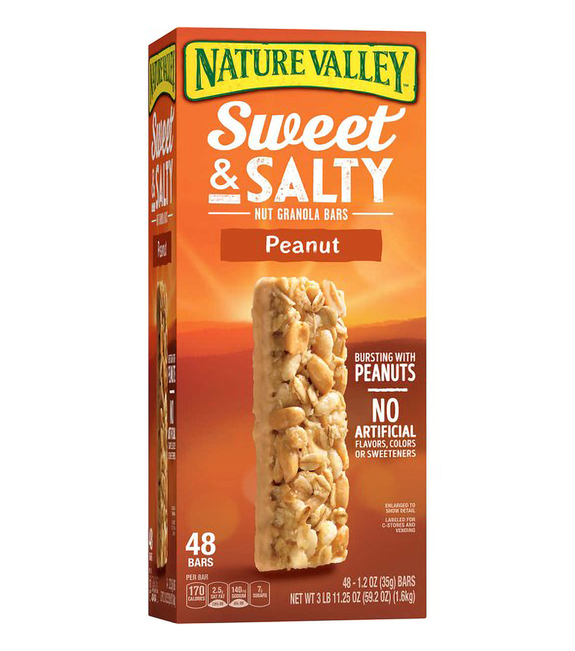 Nature Valley Sweet & Salty peanut granola bars are made with peanuts and other crunchy nuts. A great choice for an afternoon snack. No artificial flavors, colors or sweeteners. Inlcudes 48- 1.2 oz. individually wrapped bars per case. Free shipping- No returns.