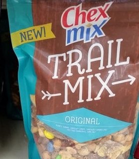 Chex Mix Original Trail Mix, 13 OzROASTED PEANUTS (PEANUTS, PEANUT OIL, SALT), ROASTED ALMONDS (ALMONDS, CANOLA, SAFFLOWER AND/OR SUNFLOWER OIL, SALT), CANDY COATED CHOCOLATE FLAVORED PIECES (CONFECTIONERY COATING [SUGAR, PARTIALLY HYDROGENATED PALM KERNEL OIL, COCOA POWDER, WHEY POWDER, NONFAT DRY MILK, SOY LECITHIN, ARTIFICIAL FLAVOR], SUGAR, ARTIFICIAL COLORING (RED 40 LAKE, YELLOW 6 LAKE, YELLOW 6, YELLOW 5 LAKE, BLUE 2 LAKE, BLUE 1 LAKE), GUM ARABIC, CORN SYRUP, CONFECTIONER'S GLAZE [CARNAUBA WAX, BEESWAX, SHELLAC]), SWEETENED DRIED CRANBERRIES (SUGAR, DRIED CRANBERRIES, GLYCERIN, CITRIC ACID, SUNFLOWER SEED OIL), DEGERMED YELLOW CORN MEAL, SUGAR, WHOLE GRAIN RICE, RICE.