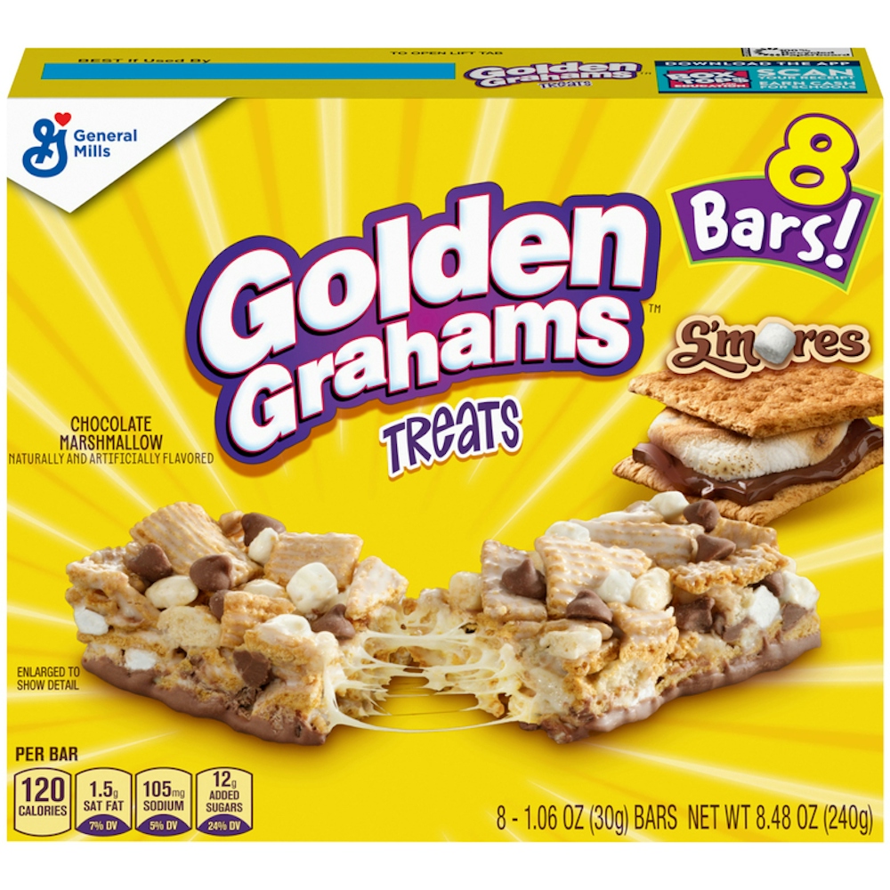 Get off to a golden start with S'mores flavored Golden Grahams Treat bars. This delicious grab and go snack is a mash-up of crispy Golden Grahams graham cracker cereal pieces plus marshmallows, chocolate flavored chips, and a chocolatey coating. It gives you a S'mores flavor that's easy to enjoy anytime, anywhere. You can take your favorite cereal with you wherever you go! When you crave a crunch, grab some sweet graham goodness. Each serving of these crispy snack bars has 120 calories. Make these individually wrapped bars a tasty part of an on the go morning snack for the family. Pack the delicious taste of S'mores in a chewy bar as convenient lunch box snacks. However you enjoy Golden Grahams Treats, they're a great way to taste your favorite cereal without needing a bowl. Contains one regular cardboard box of Golden Grahams Breakfast Cereal Treat Bars, S'mores, Snack Bars, 8 Ct, 8.48 oz; perfect for instant snacking.