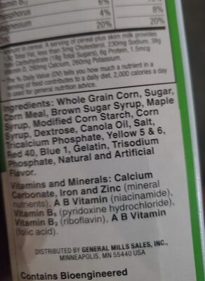 Whole Grain Corn, Sugar, Corn Meal, Brown Sugar Syrup, Maple Syrup, Modified Corn Starch, Corn Syrup, Dextrose, Canola Oil, Salt, Tricalcium Phosphate, Yellow 5 & 6, Red 40, Blue 1, Gelatin, Trisodium Phosphate, Natural and Artificial Flavor. Vitamins and Minerals: Calcium Carbonate, Iron and Zinc (Mineral Nutrients), a B Vitamin (Niacinamide), Vitamin B (Pyridoxine Hydrochloride), Vitamin B2 (Riboflavin), a B Vitamin (Folic Acid).