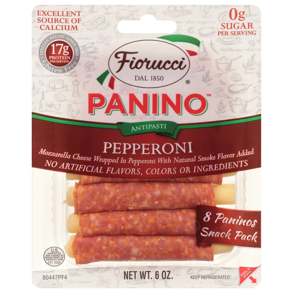 Pepperoni wrapped mozzarella cheese with natural smoke flavor added. Antipasti. US inspected and passed by Department of Agriculture. 17 g protein (per serving). Italian recipe since 1850. Gluten free. Experience the delectable taste of Fiorucci Paninos. Each one features premium cheese and meats made from our authentic Italian recipes. They are a good source of protein, and the perfect on-the-go snack! Visit FiorucciFoods.com for information on all of our products.