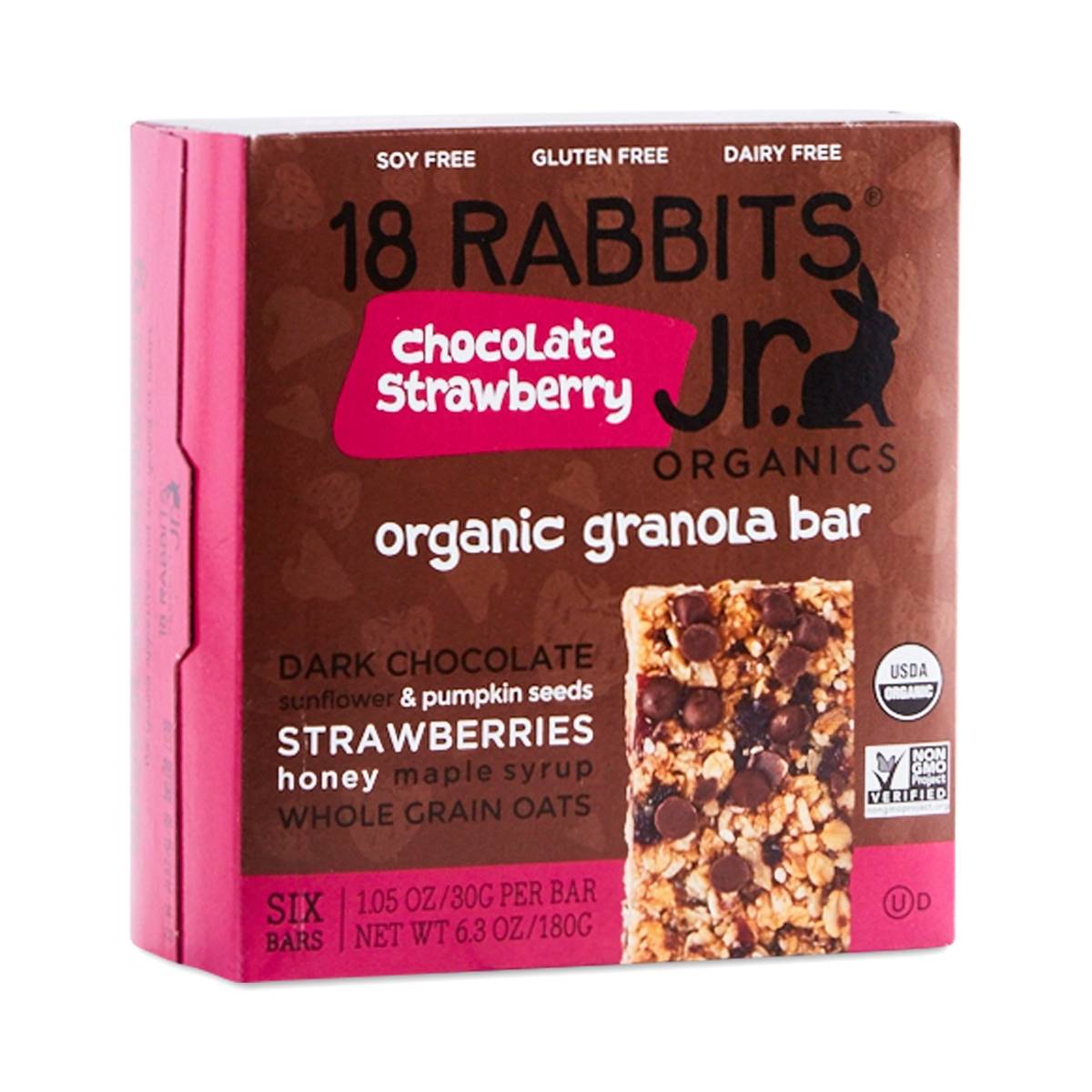 Dark chocolate. Sunflower & pumpkin seeds. Strawberries. Honey. Maple syrup. Whole grain oats. Soy free. Gluten free. Dairy free. USDA organic. Non GMO Project verified. nongmoproject.org. Thoughtfully sourced. The Traina family dries organic strawberries for 18 Rabbits in sun-drenched fields just 80 miles from San Francisco, creating a local source for the dried fruit. Most dried strawberries are infused with sugar, but our jammy flavor comes from simple strawberries. From our kitchen to you.