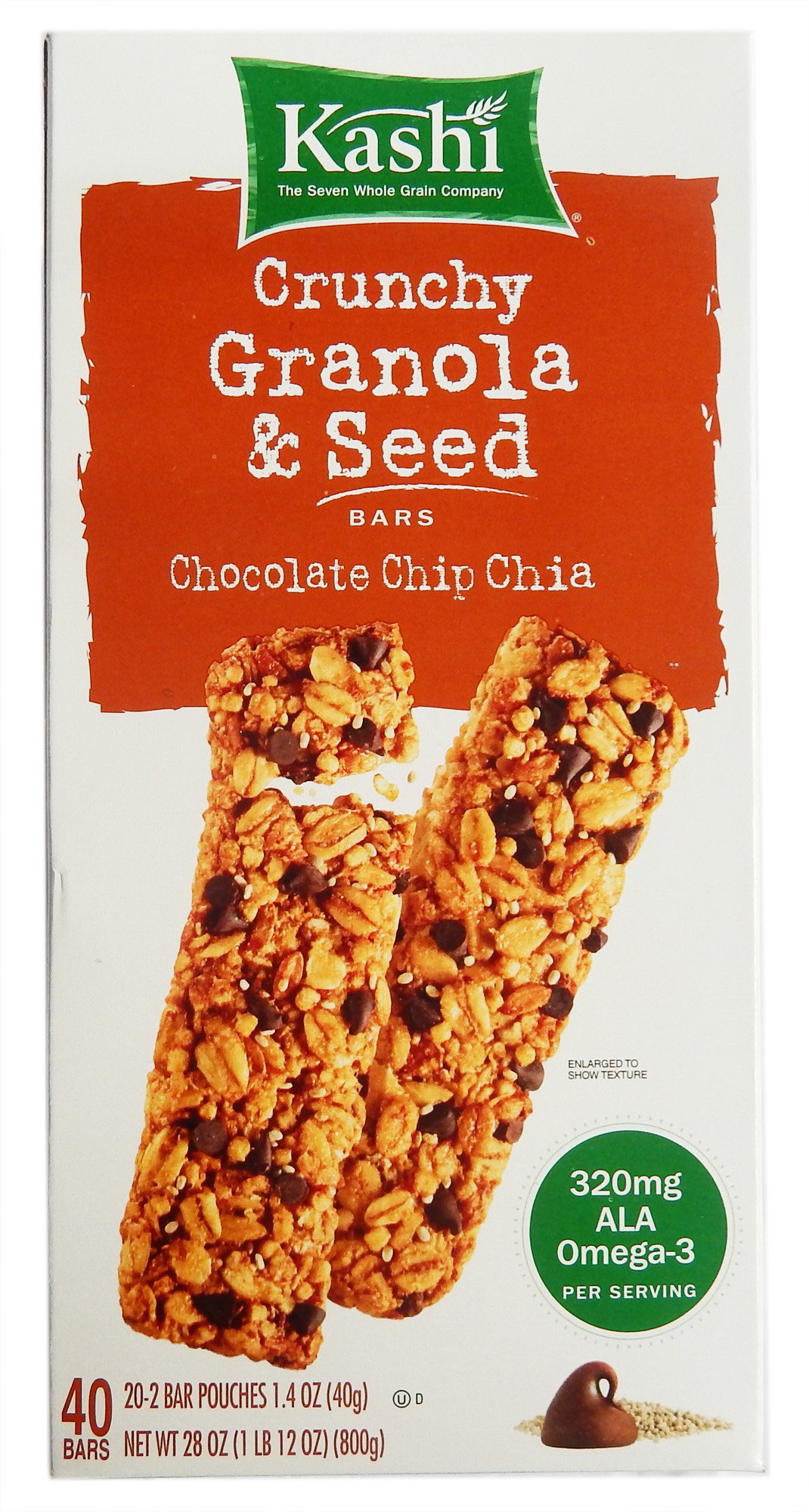 Kashi crunchy granola and seed bars - chocolate chip chia flavor is a perfect snack to get through the day. It is rich with ALA omega-3 per serving. One box contains 40 bars (20-2, 2 easy-to-break 4 pieces per pouches 1.4 ounce).