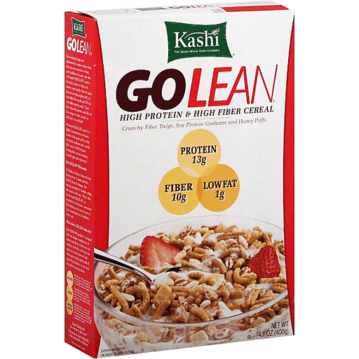 High protein & high fiber cereal. The seven whole grain company. Crunchy fiber twigs, soy protein grahams and honey puffs. Protein 13 g; fiber 10 g; lowfat 1 g. Each morning brings new opportunities to make choices that help you stay on track to being your healthiest. So start your day with Kashi GoLean cereal-the perfect choice to help you achieve your healthy lifestyle goals. Just one serving supplies 40% of your daily fiber needs and 20% of your daily protein needs. That's three times the protein and fiber of the average of other cereals (over 200 cereal s compared) to help keep you satisfied! All natural GoLean cereal is a lightly sweetened mix of honey toasted whole grain puffs, crispy soy protein grahams and crunchy fiber twigs. You'll feel great knowing that you are treating yourself right and enjoying it.