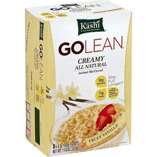 The seven whole grain company. Creamy. All natural. 9 g protein. 7 g fiber. ALA omega-3. 350 mg per serving. Stay full longer (Go Lean products are designed to promote a feeling of fullness by increasing daily intake of protein and fiber.)! See back panel for information. Kashi Go Lean instant hot cereal helps you stay satisfied and on track to being your healthiest. So treat yourself right and enjoy it with a bowl of warm, creamy cereal touched with the natural sweetness of vanilla. At Kashi, we believe that everyone has the power to make positive healthy lifestyle changes. But staying committed to healthy eating and exercises isn't easy. That's why we developed Go Lean, an assortment of delicious, convenient food options, to be an easy part of your commitment to a healthier, leaner you.