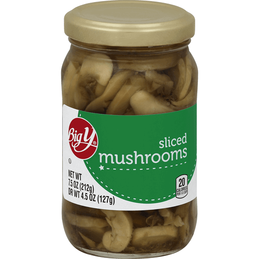 Sliced Mushrooms is manufactured by Big Y Foods, Inc. with a suggested serving size of 1 Container, (drained) (127 G) and has 36 calories per serving.