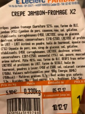 Crêpes Jambon Fromage (Garniture 52%•. Eau, Farine De Ble, Jambon (4%) (Jambon De Porc, Couenne, Eau, Sel, Gélatine, Stabilisants: Carraghénanes-E450, Lactose, Sirop De Glucose, Dextrose, Arômes, Conservateurs: E316-E250), Lactose Et Protéines De Lait - Lait Écrémé En Poudre, Huile De Tournesol, Épaule Cuite (2%) (Épaule De Porc, Eau, Sirop De Glucose. Sel, Gélatine, Stabilisants: E450, Carraghénanes, Lactose, Dextrose, Arômes, Conservateurs: E301-E250), Emmental (1%), Sel, Poivre, Muscade, Arôme Naturel. Pâte 48%: Eau, Farine De Ble, Oeufs Frais Entiers, Lactose Et Protéines De Lait. Farine De Seigle, Huile De Tournesol, Poudres À Lever: E450 Et E500, Sel, Colorant: Caramel E150B).