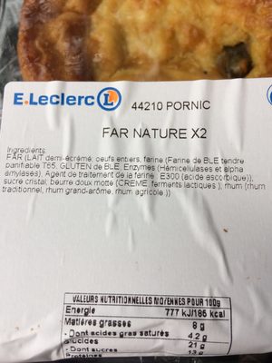 Far (_Lait_ Demi-Écrémé, _Œufs_ Entiers, Farine (Farine De _Blé_ Tendre Panifiable T65, _Gluten De Blé_, Enzymes (Hémiceliulases Et Alpha-Amylases). Agent De Traitement De La Farine: E300 (Acide Ascorbique)) Sucre Cristal; Beurre Doux Motte (_Crème_, Ferments Lactiques ) Rhum (Rhum Traditionnel, Rhum Grand-Arôme, Rhum Agricole.))