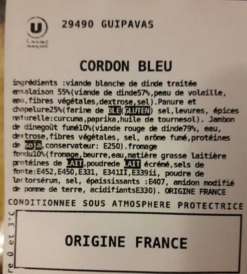 Viande Blanche De Dinde Traitée En Salaison 55% (Viande De Dinde 57%, Peau De Volaille, Eau, Fibres Végétales, Dextrose, Sel). Panure Et Chapelure 25% (Farine De Ble (Gluten) Sel, Levures, Épices Naturelle: Curcuma, Paprika, Huile De Tournesol). Jambon De Dinegoût Fumé 10% (Viande Rouge De Dinde 79%, Eau, Dextrose, Fibres Végétales, Sel, Arôme Fumé, Protéines De Soja, Conservateur: E250). Fromage Fondu 10% (Fromage, Beurre, Eau, Matière Grasse Laitière Protéines De Lait, Poudre De Lait Écrémé, Sels De Fonte: E452, E450, E331, E341Ii, E339Ii, Poudre De Lactosérum, Sel, Épaississants :E407, Amidon Modifié De Pomme De Terre, Acidifiants E330). Origine France