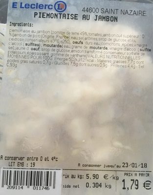 Piemonaise Au Jambon (Pomme De Terre 49% Tomates, Jambon Cuit Supérieur 10% (Jambon De Porc(Origine France) Eau Sel Arômes Sirop De Glucose,Et Loc Cextrose, Conservateurse E316, E250), Oeufs Durs Eau, Cornichons,Épices, Vinaigre D'Alcool ( Sulfites) Moutarde( Eau Graine De Moutarde, Vinaigre D'Alcool ( Sulfite Sel)Jaune D Oeuf, Strop De Glucose,Amidon Transformé,Conservateur Sorbate De Potassium, Épaississant Gomme De Xanthane)