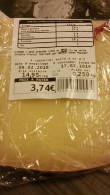 Miaqe F Pâte Pressée Cuite Au Cru De Vache Rigxne France) Fabriqué Par 39800 Polieuy. a Conserver Entre O Et 40 C Ate D'Emballage