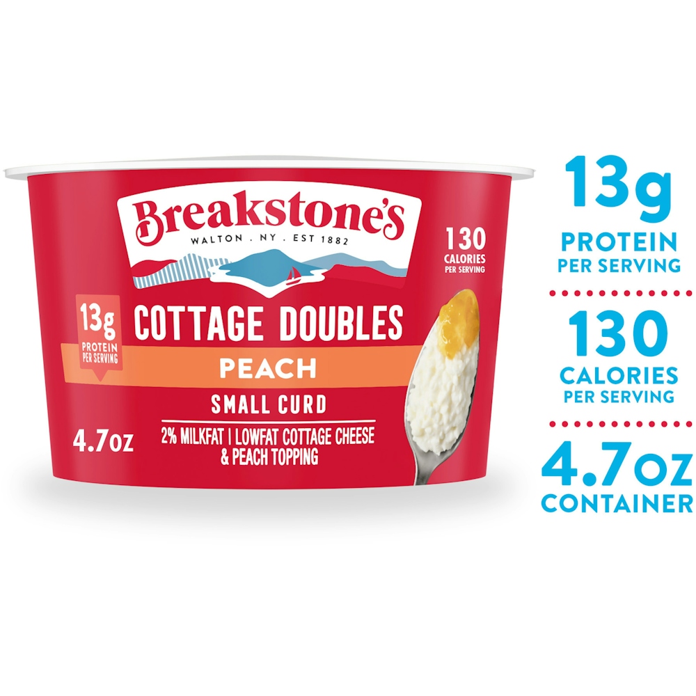 The Breakstones Cottage Doubles Peach Cottage Cheese delivers a smooth texture and classic cottage cheese taste. Made with cultured pasteurized Grade A skim milk, milk, cream and yummy peach topping, it makes for a great lunch or a breakfast option. Sealed in a single-serve container, it makes the cottage cheese easy-to-store and a great on-the-go meal option. This Breakstones cottage cheese is an ideal option for office pantries, school cafeterias, and retail stores.