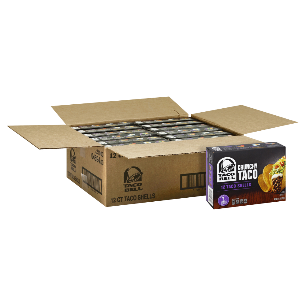 Taco Bell Crunchy Taco Shells will make every night feel like Taco Bell night. Our restaurant-quality taco shells are made with yellow corn flour for a delicious flavor. Simply add ground beef or chicken, Taco Bell seasoning, Taco Bell salsa and your favorite toppings to complete your Taco Bell dinner. Preparation is easy. Just bake the crunchy taco shells on a baking sheet in the oven for 3-5 minutes. Dress up your crunchy tacos with sour cream, salsa, shredded cheese, shredded lettuce, tomatoes and more. One 4.5 ounce box makes about 4 servings. Make it Taco Bell tonight.