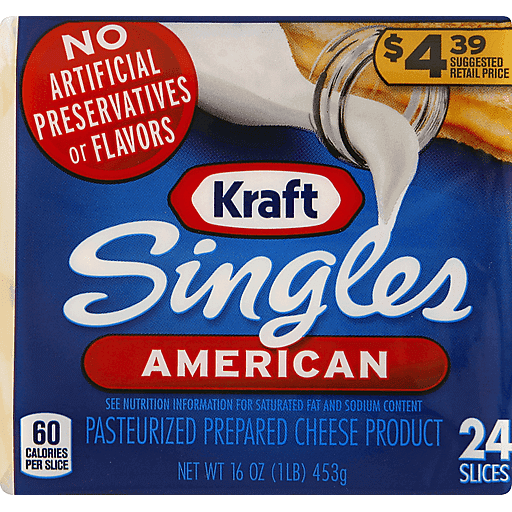 Kraft Singles has been bringing the family together for over 100 years. The unmistakable creamy melt and American flavor is perfect for cheeseburgers, grilled cheese sandwiches, and so much more! Get our 24-count package of American Cheese slices for that melty, great American taste you love with no artificial preservatives or flavors.